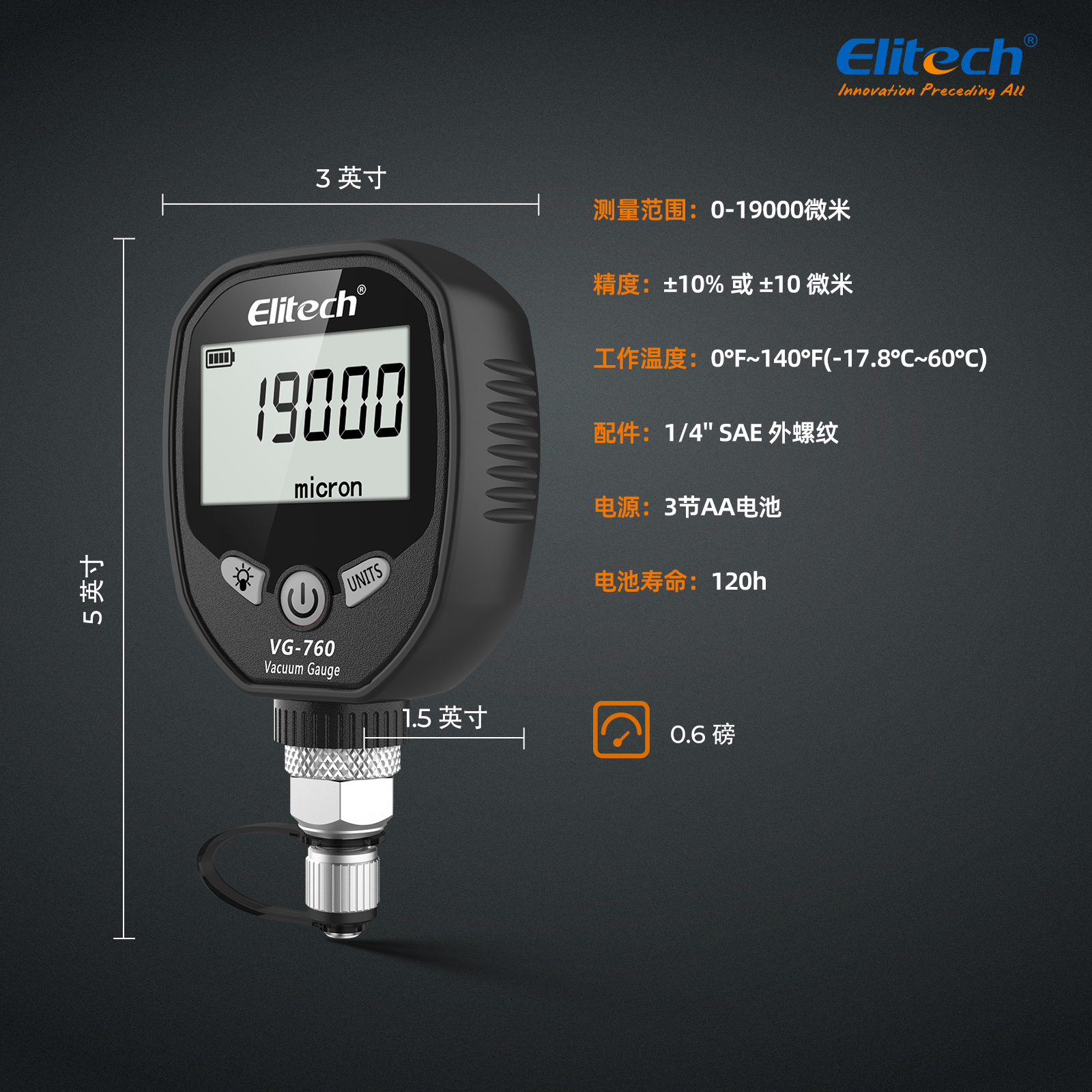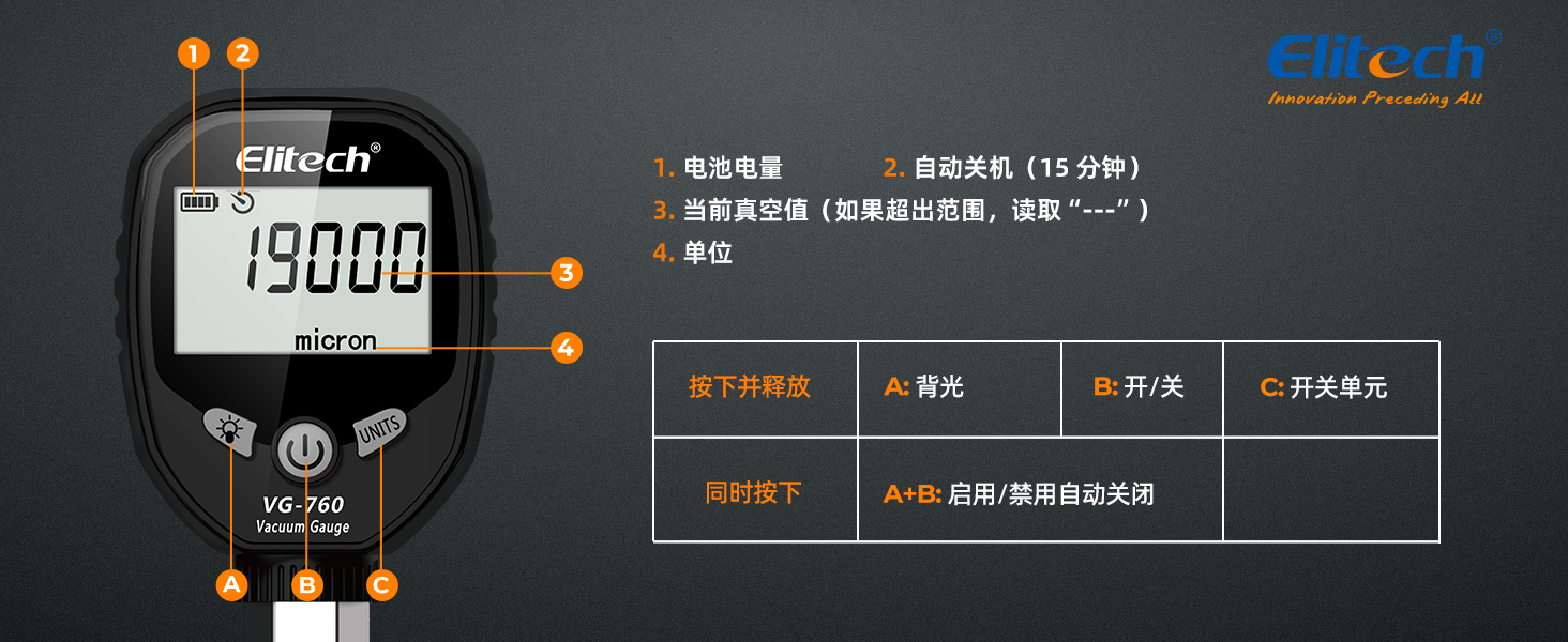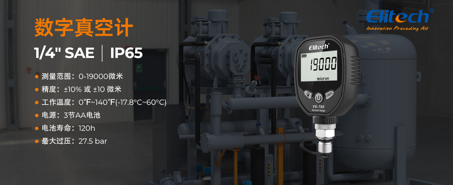 VG-760 是一種數字真空計,用于在填充制冷劑期間獲得準確的真空測量值。 它具有專業的真空傳感器,可精確測試真空度。 暖通制冷系統的抽真空是抽空系統中的空氣和水分,如果與制冷劑混合,可能會產生酸性化學反應,長期對系統造成損害。 一般來說,系統真空度應在700微米以下,這樣才能有效降低系統中的水分。 最佳真空度為 300 微米。 普通制冷劑達不到這個要求。 VG-760用于測試系統泄漏和辨別真空泵質量。