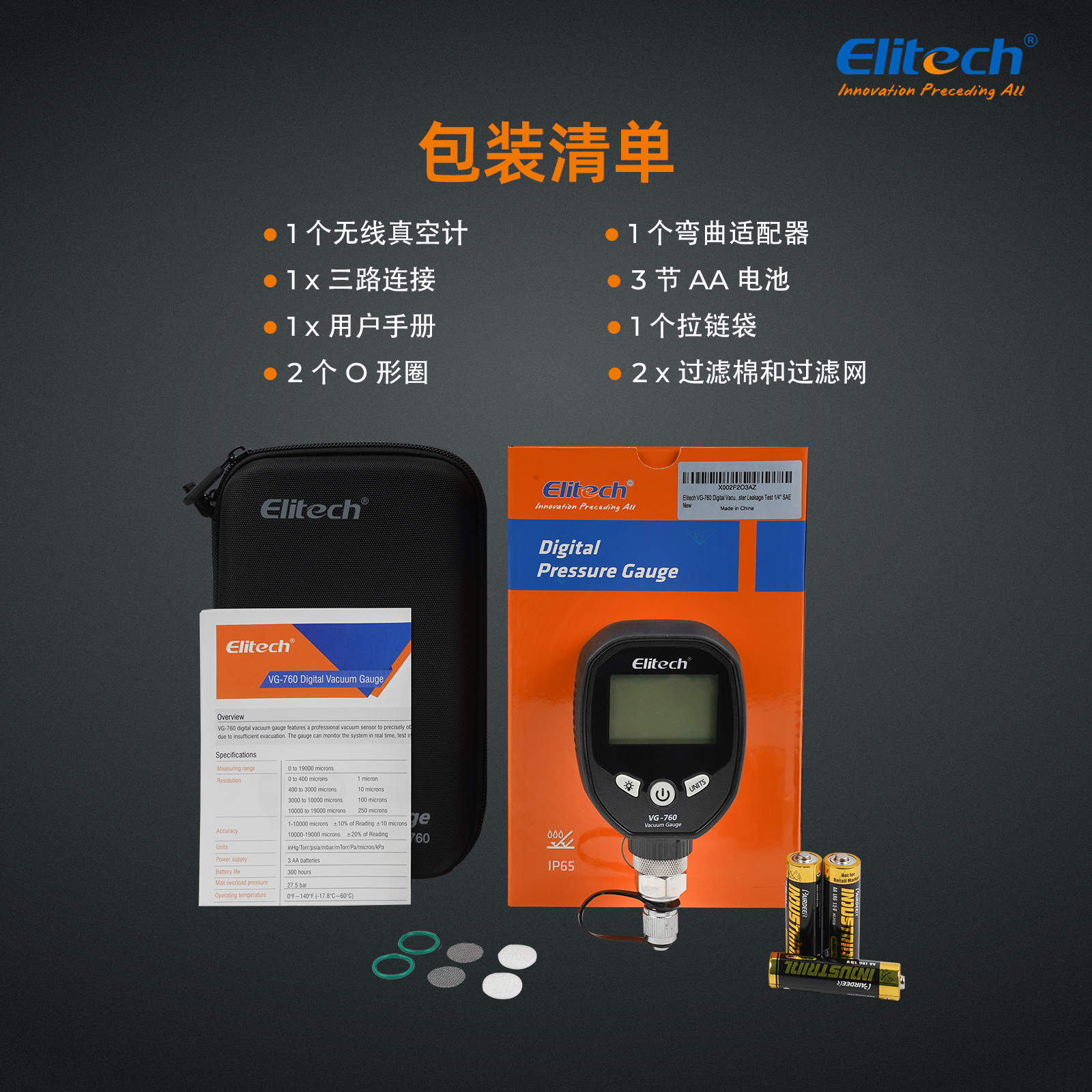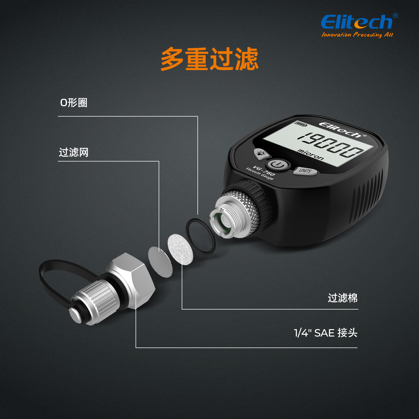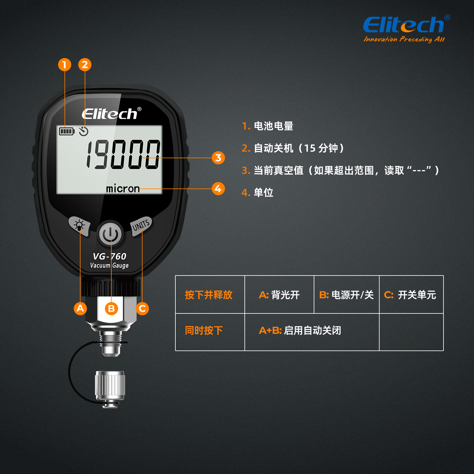 VG-760 是一種數字真空計,用于在填充制冷劑期間獲得準確的真空測量值。 它具有專業的真空傳感器,可精確測試真空度。 暖通制冷系統的抽真空是抽空系統中的空氣和水分,如果與制冷劑混合,可能會產生酸性化學反應,長期對系統造成損害。 一般來說,系統真空度應在700微米以下,這樣才能有效降低系統中的水分。 最佳真空度為 300 微米。 普通制冷劑達不到這個要求。 VG-760用于測試系統泄漏和辨別真空泵質量。
