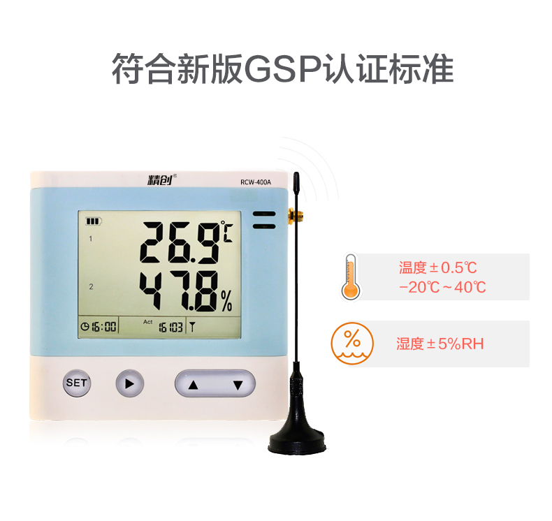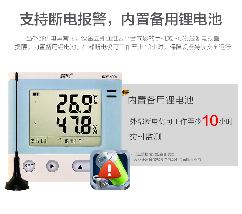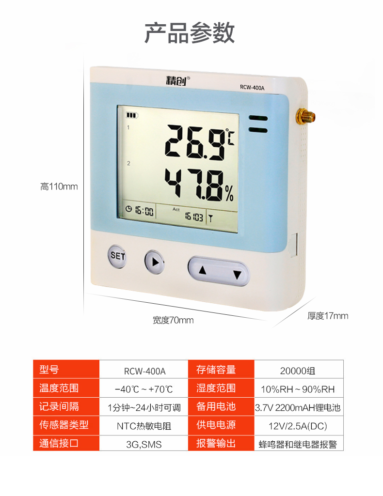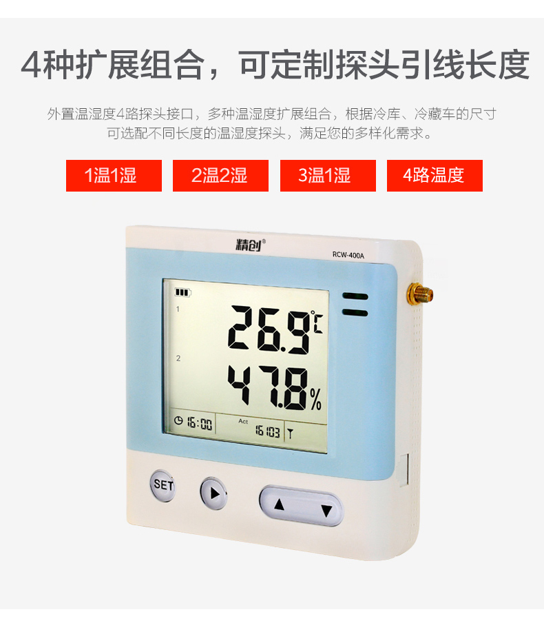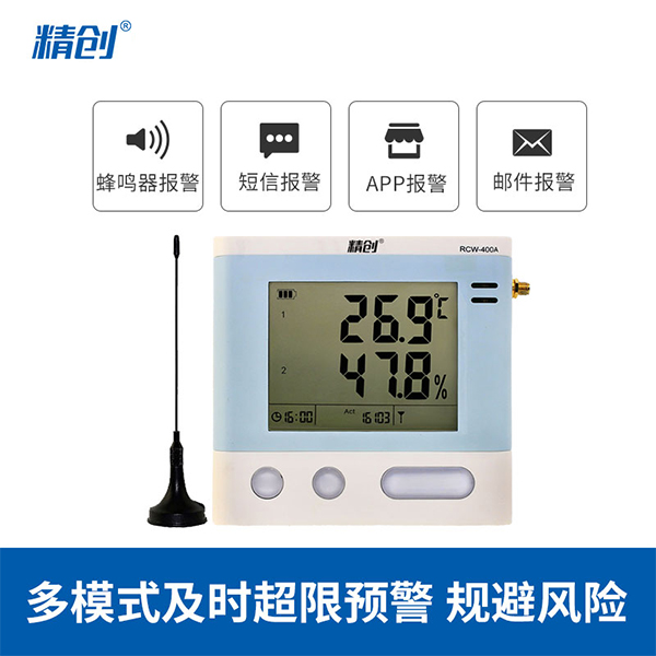 RCW-400A 是一款 4 路溫濕度記錄儀,具有測溫范圍寬、精度高等優點。段式液晶屏可同時顯示系統時 鐘、當前工作狀態、記錄容量以及記錄數據。內置蜂鳴器以及外接聲光報警器,具備無線 3G 或4G 網絡數據傳輸方式, 結合冷鏈物聯網平臺,在可上網終端上隨時查看溫濕度數據。
