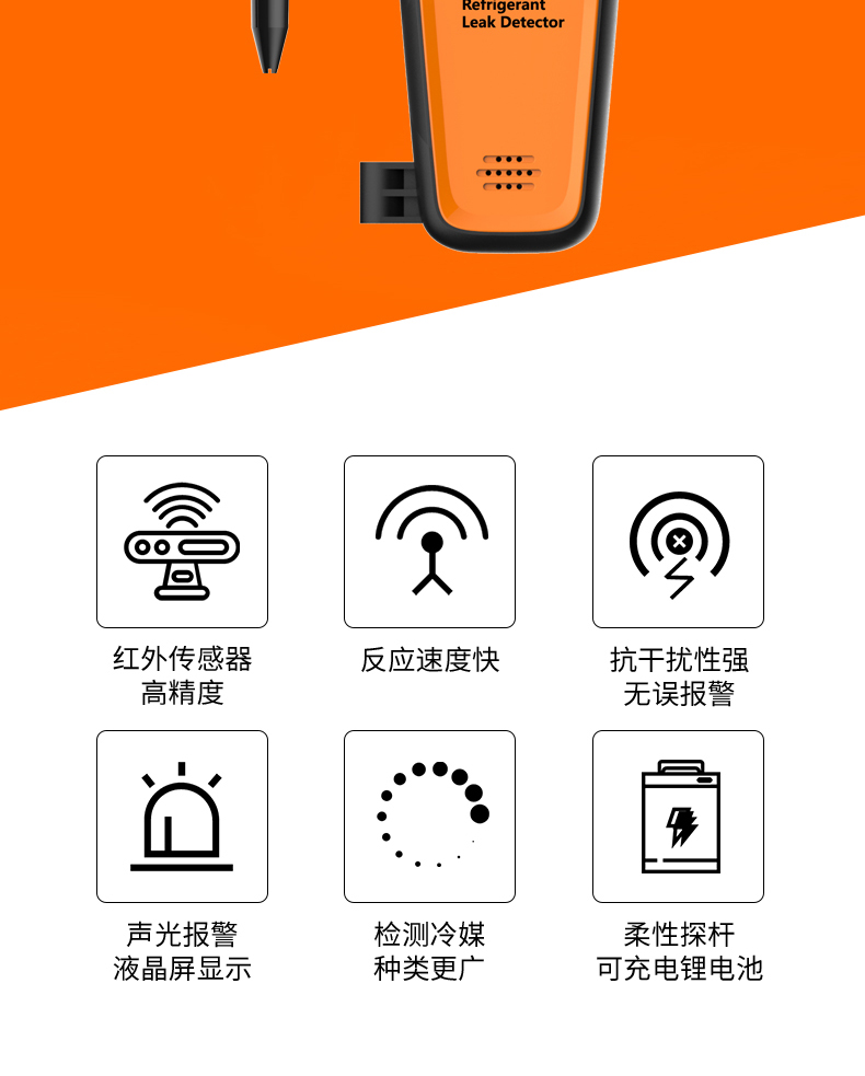 主要用于制冷設備維修行業,檢測冷凍柜、空調、冷庫等大型制冷系統冷媒有無泄漏并準確找岀泄漏點。
